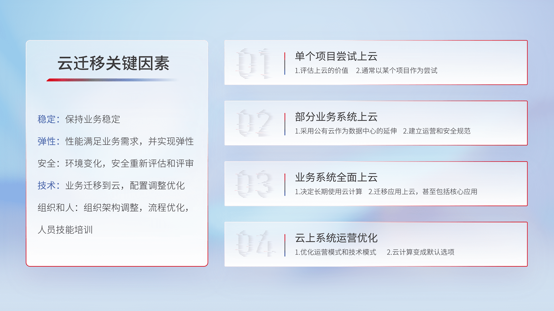 结合实际业务,,,从规划设计、、、、云平台选型、、、云原生改造、、数据迁移、、集成交付,,迁移全过程为客户识别最佳上云路径,,做好风险识别管理,,设计网络架构、、、身份权限、、、、安全审计合规、、、、操作审计、、、、日志审计、、、监控告警策略、、多站点容灾设计等,,,,对云上基础设施进行整体规划,,,,提升IT治理水平,,以满足弹性、、高可用、、高性能的需求。。。。