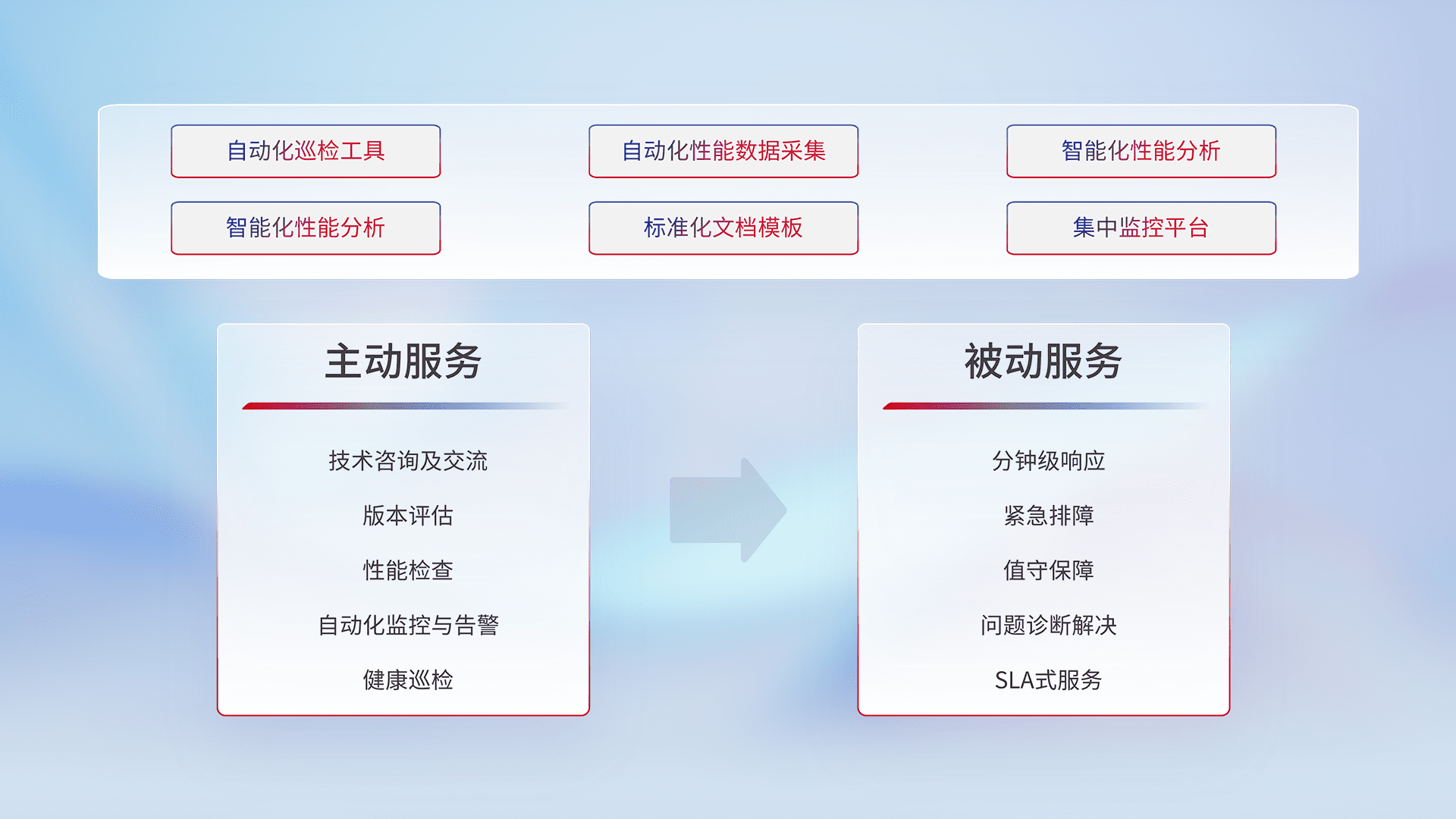 智能化工具和标准化文档,,,保障服务质量,,提供主动服务(包含技术咨询、、、、版本评估、、性能检查、、、自动化监控与告警、、健康巡检)和被动服务包含(分钟级响应、、、紧急排障、、值守保障、、问题诊断解决、、、、SLA服务)。。。